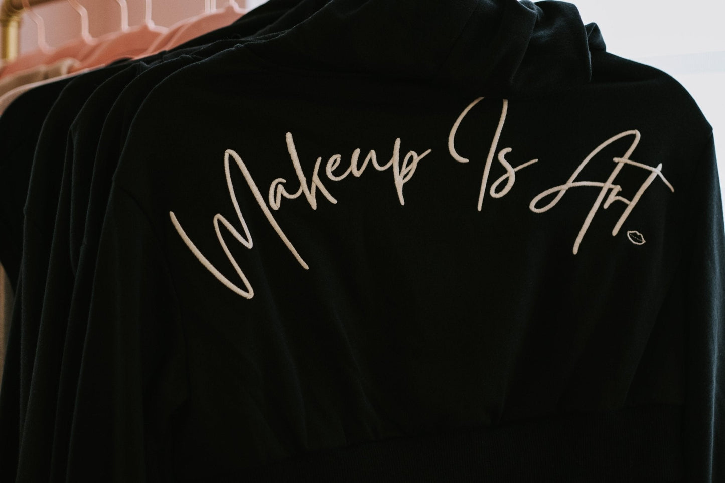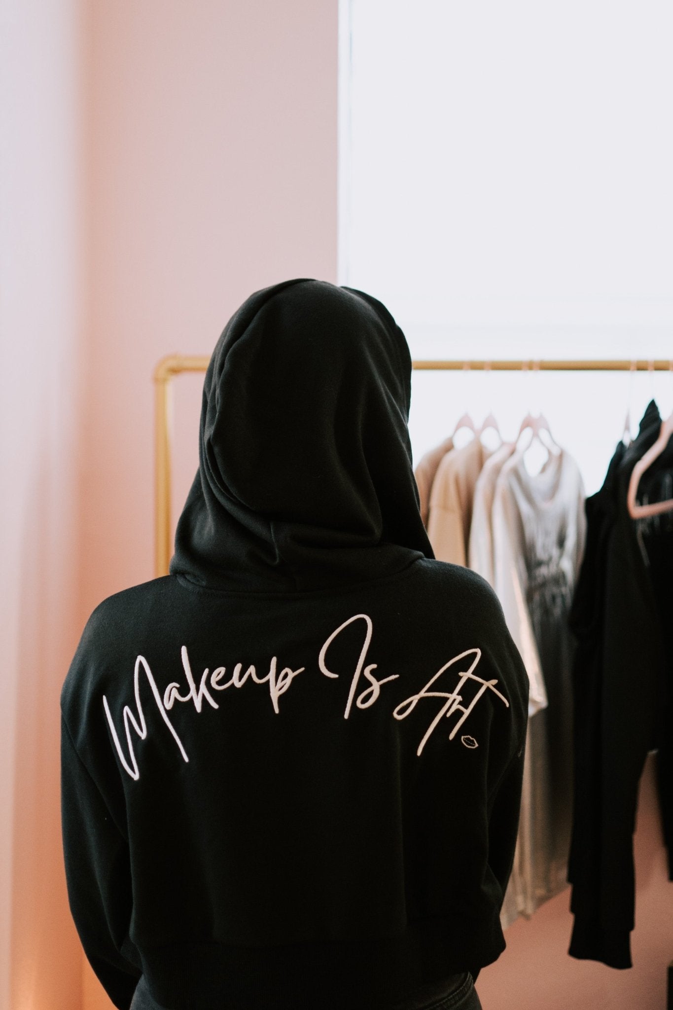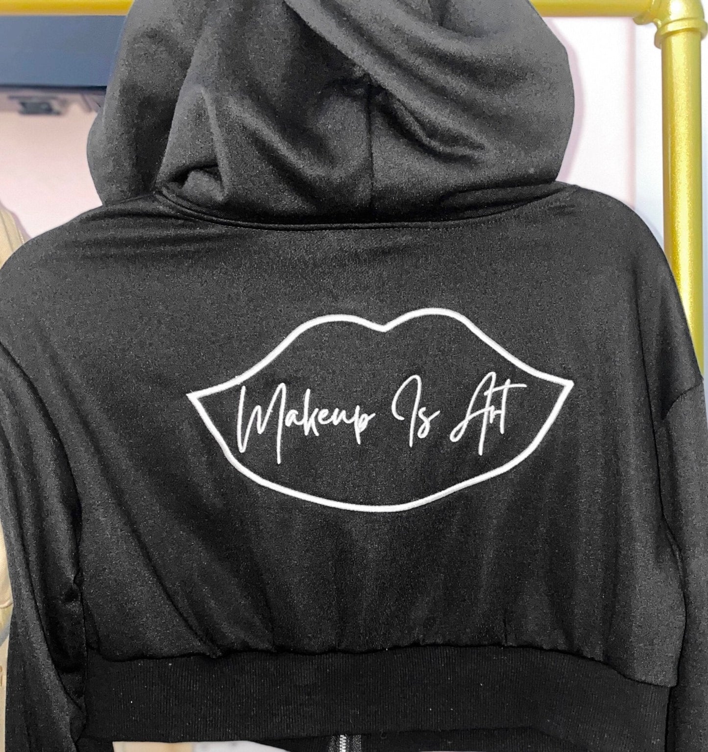 This cropped black Hoodie displays the iconic Makeup is Art logo in the form of embroidery. A secure zip fastening ensures a snug and ideal fit.